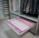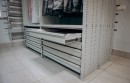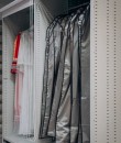 Установили высокий стационарный металлический двухсекционный шкаф с верхней развеской одежды, закрывающейся тканевой жалюзи и нижними ящиками полного выдвижения для других предметов гардероба.
