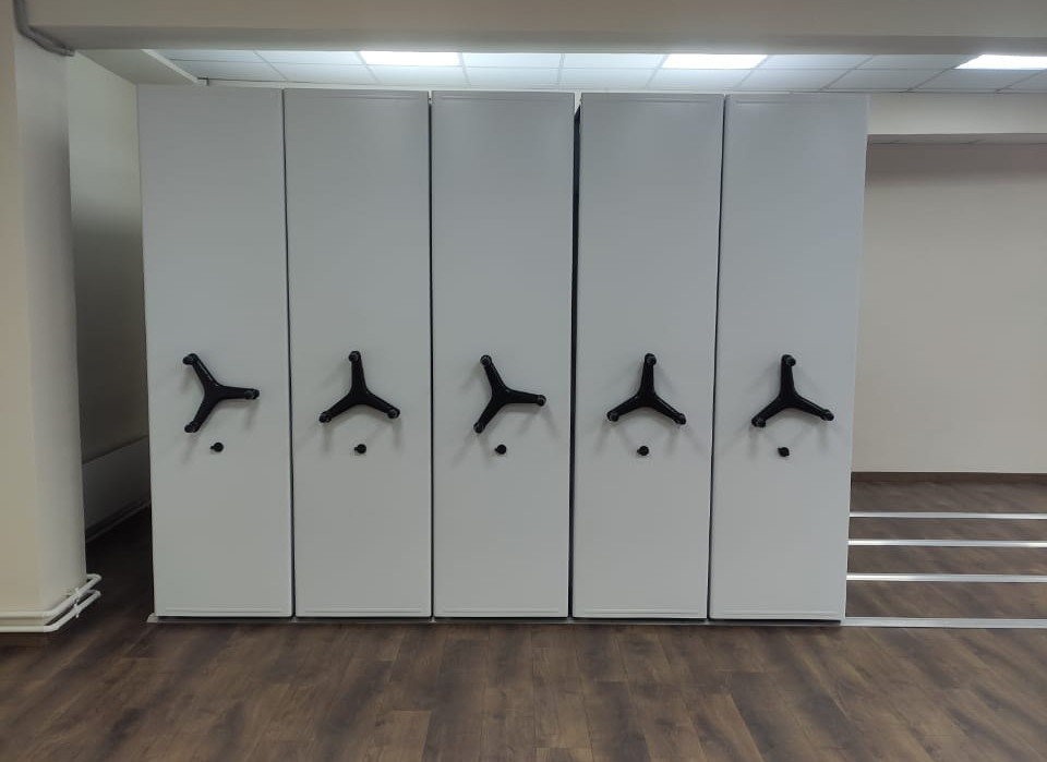Стеллажи двигаются за счет электропривода и управляются кнопками, сенсорным экраном или компьютерной АРМ системой. Для больших мобильных архивов с автоматизированной системой доступа.